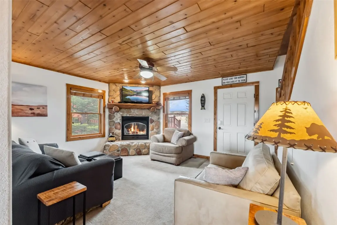 NEW LOW PRICE FOR THIS 3 bed / 2 bath home! HIGH DEMAND SHORT TERM RENTAL or perfect full time residence! Situated perfectly within the neighborhood of Whispering Aspens, this large cabin oozes character and charm throughout! The light and bright kitchen area is the hub of the home with unobstructed views from the large windows and has space for all! Cozy up in the family room warmed by tongue & groove ceilings and a gas fireplace. With 1 bedroom and 1 full bath on the main level & 2 additional bedrooms with soaring ceilings and a 2nd full bath upstairs, the cabin lives large. The oversized deck and patio offer a relaxing retreat or take advantage of the Clubhouse only a short walk away. Hiking is right outside your door with 1 1/2 miles of hiking trails within 160 acres of adjacent BLM Land. This low maintenance cabin is located for 4 seasons of enjoyment as it is just 1/4 mile from HWY 285 allowing for an easy drive to Breckenridge (30min), Buena Vista (30min), Denver and Colorado Springs (1+ hour). Enjoy the conveniences of Fairplay with numerous bars and restaurants, town festivals like Burro Days, and river access along the South Platte River just down the street at the Fairplay Beach! Make this your full time home or use as an investment property with a successful history as a Short Term Rental! Embrace mountain living NOW!