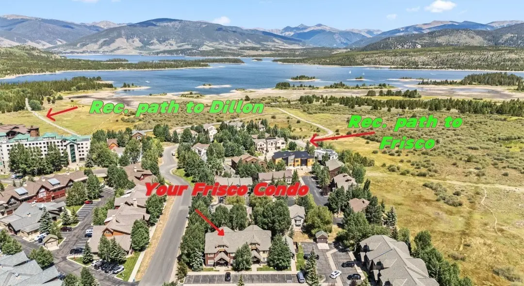 Top-floor 2-bedroom Tarn Landing condo with vaulted ceilings, an open floor plan, and a quiet back deck. Utilities are included in the HOA fee (with the exception of electric) in the Prime location with direct access to the recreation path—bike to historic Main Street Frisco—or walk to Starbucks, Whole Foods, Natural Grocers, and Outer Range Brewery. The Summit Stage Transfer Center is nearby for easy access to Breckenridge, Copper Mountain, and Keystone. Interior highlights include updated trim, carpet, stainless steel appliances, and lighting. Upstairs features a quiet office nook with a west-facing window. Very clean, furnished, and turn-key. Three full bathrooms, each with a shower; two also feature bathtubs. Large bedrooms, in-unit washer and dryer, and generous deck storage for skis and boards make this condo ideal for hosting guests.