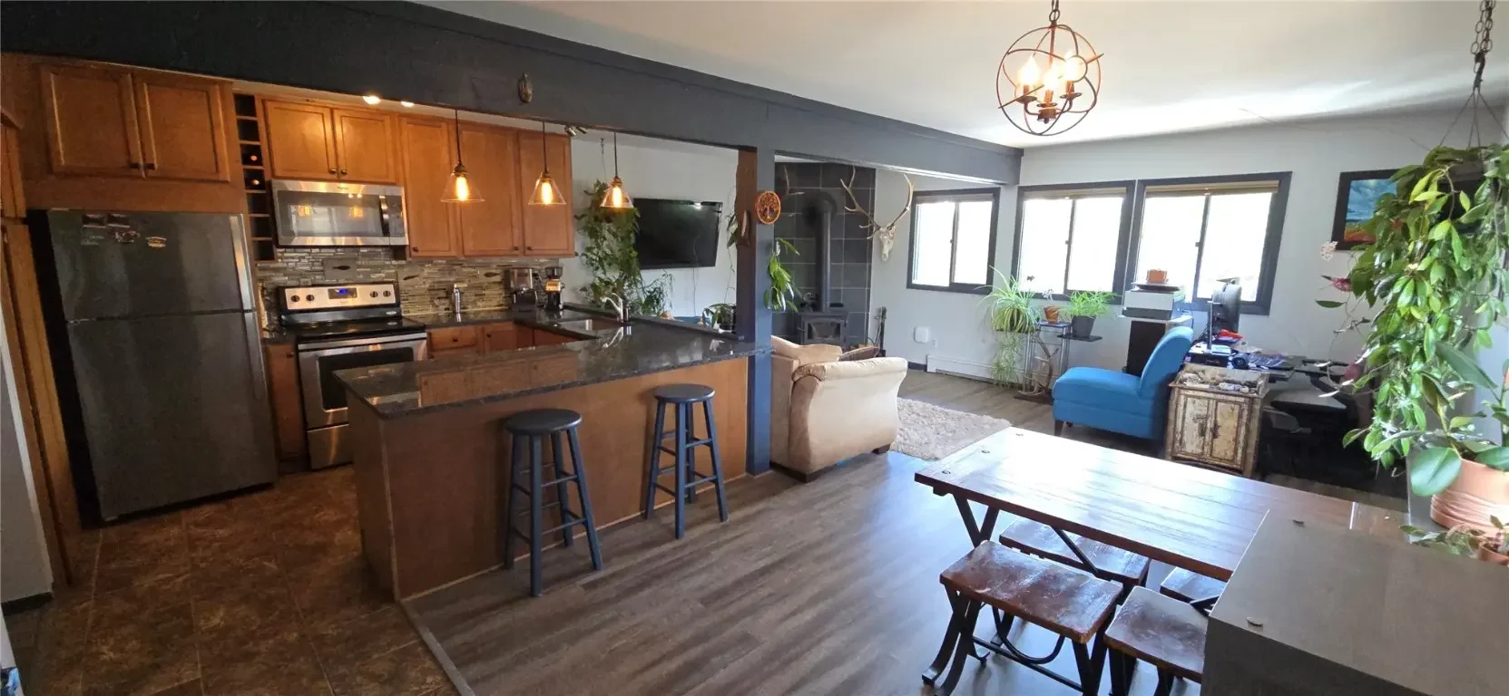 Live the dream in this top-floor 2 bedroom 2 bath mountain retreat with breathtaking views. Wake up to sweeping vistas of the Rockies and step into adventure with National Forest access just outside your back door. Hike miles of trails in the summer and in the winter snowshoe or skin up and ski Buffalo Mountains' iconic Silver Couloir — one of North America’s 50 classic ski descents right in your backyard After a day in the mountains, come home and unwind by the cozy wood-burning stove. Enjoy peace and quiet with no upstairs neighbors, This fully updated condo features granite countertops, luxury vinyl plank flooring, new appliances, and fresh paint throughout — all move-in ready. Located just 20 minutes from five world-class ski resorts, and with a convenient bus stop right across the street, you’ll have seamless access to everything Summit County has to offer — skiing, biking, fishing, shopping, dining, convenient to the renowned Silverthorne Recreation Center and more! Bonus: HOA is in good standing for peace of mind Monthly dues also inlcude Heat, WIfi and Cable TV and more! Convenient onsite laundry facilities has easy to use phone app to pay. Couch, Ottoman Living room TV table, Stools and Living Room TV also included.