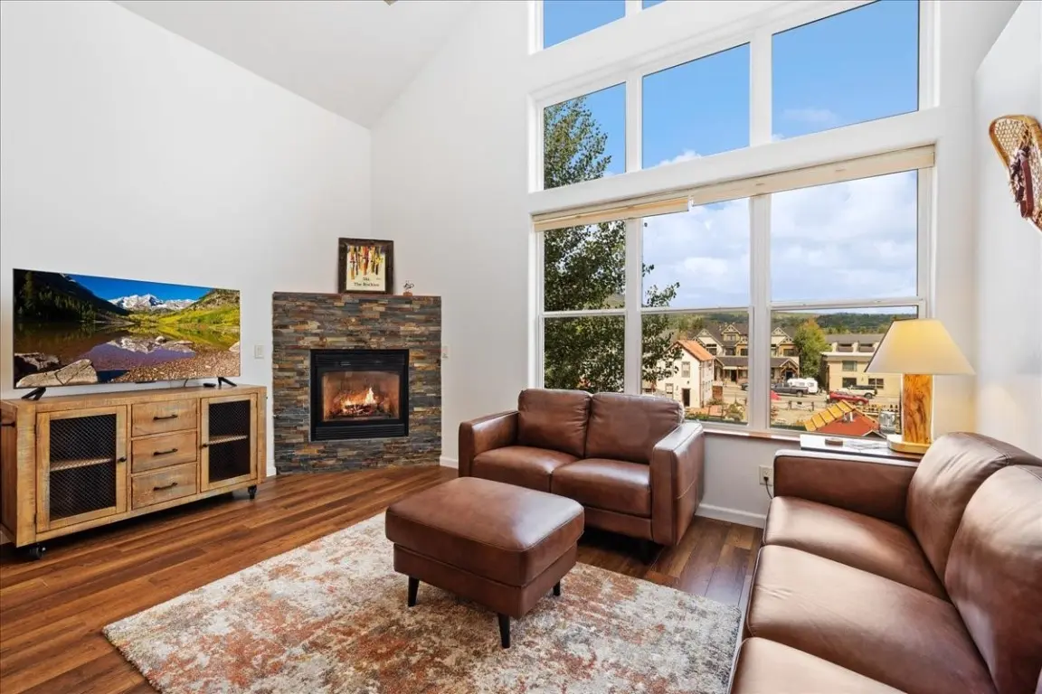 NEW TO MARKET - Beautiful top floor end unit with huge views of Buffalo Mt! Warm wood flooring flows throughout the open floorplan main area. Entertain in the large kitchen with cherry cabinets, quartz counters and stainless steel appliances; adjacent to the comfortable Living Room with gas fireplace, vaulted ceilings and two stories of windows to admire the expansive views towards the Gore Range. Rest & recharge in the quiet Primary Bedroom. The large loft area features plenty of additional sleeping room plus it's own en suite full bathroom. In-floor radiant heat keeps both home & toes equally warm throughout. Community includes a large heated underground common garage with designated parking for two cars, plus an assigned garage storage area perfect for outdoor gear. Enjoy this central location - Only one block to the heart of Frisco's Historic Main St or Summit Stage stops for Copper and Breckenridge, and just a short walk to the Frisco Marina, hiking & bike trails, parks, etc. Strong Rental Income potential - Short Term Rentals are allowed by the community with property subject to Frisco Licensing Requirement.