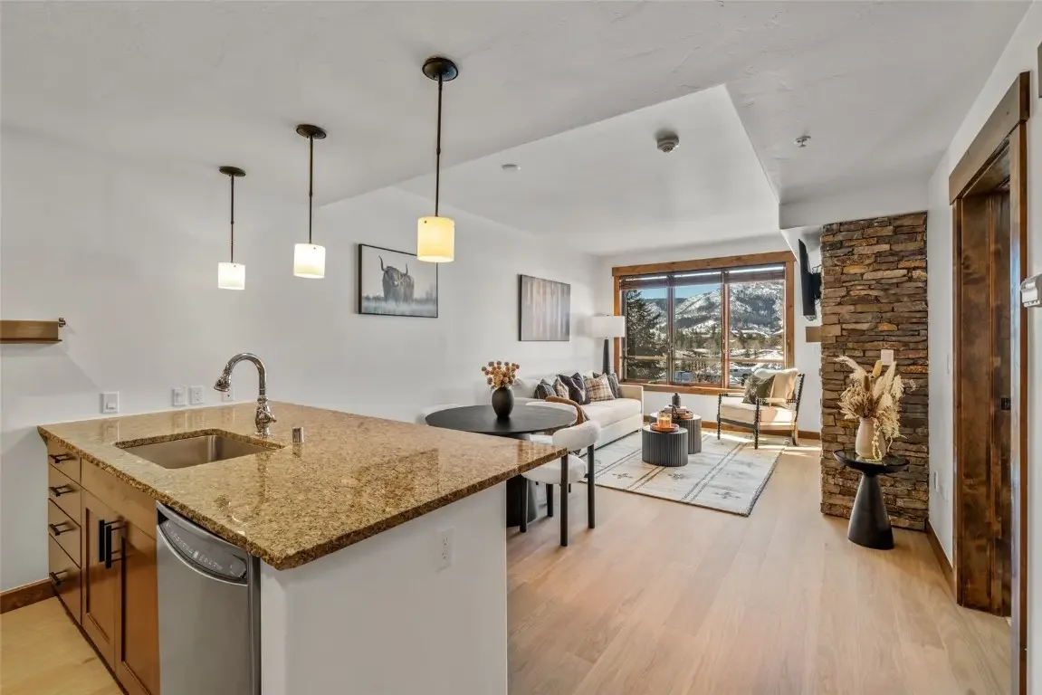 Escape to the mountains in this beautiful, modern 1-bedroom, 1-bathroom condo, where comfort meets convenience in an unbeatable location. Offering Emerald Mountain views, this cozy retreat is the perfect getaway for ski enthusiasts, outdoor adventurers, or those simply looking to relax in style. Step inside to discover new furnishings and elegant hardwood flooring that adds warmth and character to the space. The inviting living area features a stone fireplace, perfect for cozying up after a day on the slopes. The modern kitchen boasts granite countertops and plenty of space for preparing meals, whether you're making a hearty breakfast before hitting the trails or a gourmet dinner to enjoy with friends and family. Beyond the condo itself, the community offers an array of resort-style amenities, including a heated lap pool, 3 hot tubs, fitness center, game room, outdoor firepit, and BBQ area—all designed to enhance your mountain-living experience. Enjoy sunset views from your private balcony. It's perfectly set up for skiers featuring deluxe boot dryers, ski storage, winter shuttle and best of all, a private gondola is just steps from your door, providing effortless access to the ski mountain in record time. Additional benefits include in unit washer/dryer, central air and heated underground garage. Whether you're looking for a seasonal escape or a year-round residence, this condo delivers a seamless blend of comfort, style, and convenience in one of the most desirable locations. Don't miss your chance to own this incredible mountain retreat with short term rental income if you desire.