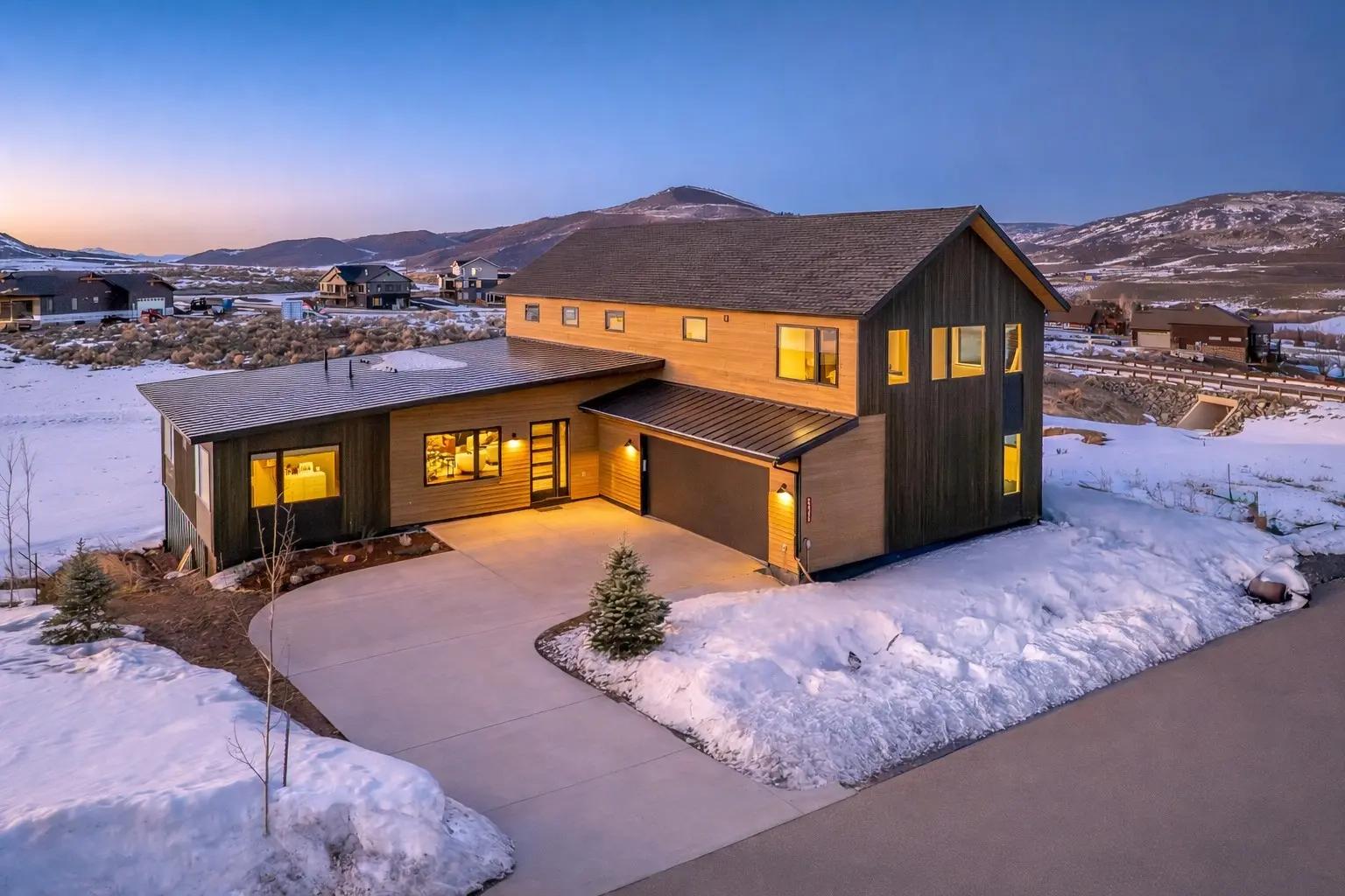 Located within Stagecoachâs Neighborhoods at Youngâs Peak, this striking contemporary mountain home commands attention with unobstructed views of Stagecoach Mountain Ranch, Youngâs Peak, and surrounding ranges from arrival. Built in 2024 by Saltbox Custom Homes, the 4,400-sq-ft residence showcases clean architectural lines, barnwood-inspired siding, expansive sunlit interiors, and a sleek integration of wood and natural materials. The great room features 14-foot ceilings, a linear fireplace framed by a floor-to-ceiling barnwood surround, walls of windows that bathe interiors in natural light, and glass doors that open to a sunset-view terrace. A 30-foot vaulted ceiling with clerestory windows rises above the dining area and kitchen, with Quartz countertops, London blue cabinetry, brass finishes, oversized island, soft-close drawers, and a Thor range, creating a space for everyday life and entertaining. Two main-level bedrooms capture multi-directional views and share a spacious bath. A floating wood staircase with metal railing leads to the upper level, featuring a sitting area with Stagecoach Reservoir views, the primary bedroom with a 20-foot vaulted ceiling, motorized blackout shades, and sunrise views, and an ensuite bath with dual vanities, oversized soaking tub, and walk-in closet. The lower level offers a generous second living area opening to a covered patio and large, flat backyard, a spacious bunk room, additional oversized 5th bedroom that can serve as a gym or theater, a full bath, and substantial storage. Additional features include a 2-car garage with deep storage, mudroom with laundry and sink, all-electric efficiency, wide-plank LV flooring with in-floor heat, Nest thermostats, and built-in Sonos surround sound. The home backs to community-maintained open space with direct access to trails at Youngâs Peak, and is just 1.4 miles from the Stagecoach Reservoir. Located in the South Routt School District with a low HOA.